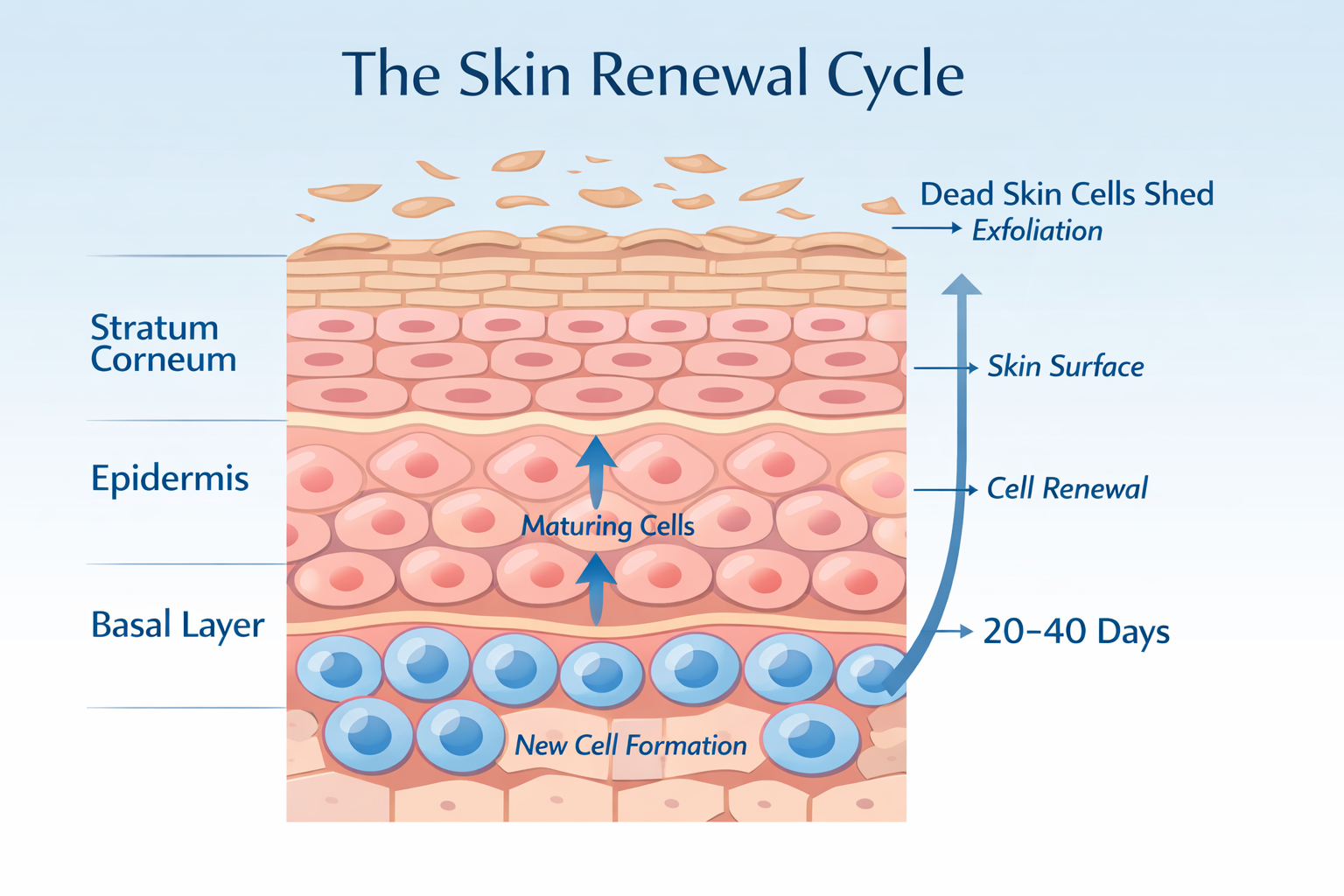 This natural renewal cycle typically takes about 28 to 40 days depending on age and skin health.